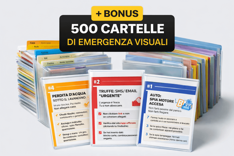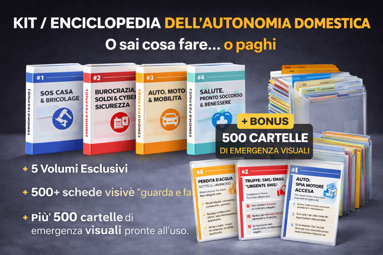 Il Kit dell’Autonomia Domestica nasce dall’esperienza reale sul campo: guasti, emergenze, burocrazia, errori che costano soldi. Ogni scheda risponde a una sola domanda: “Se succede adesso, cosa devo fare per non sbagliare e non farmi fregare?”