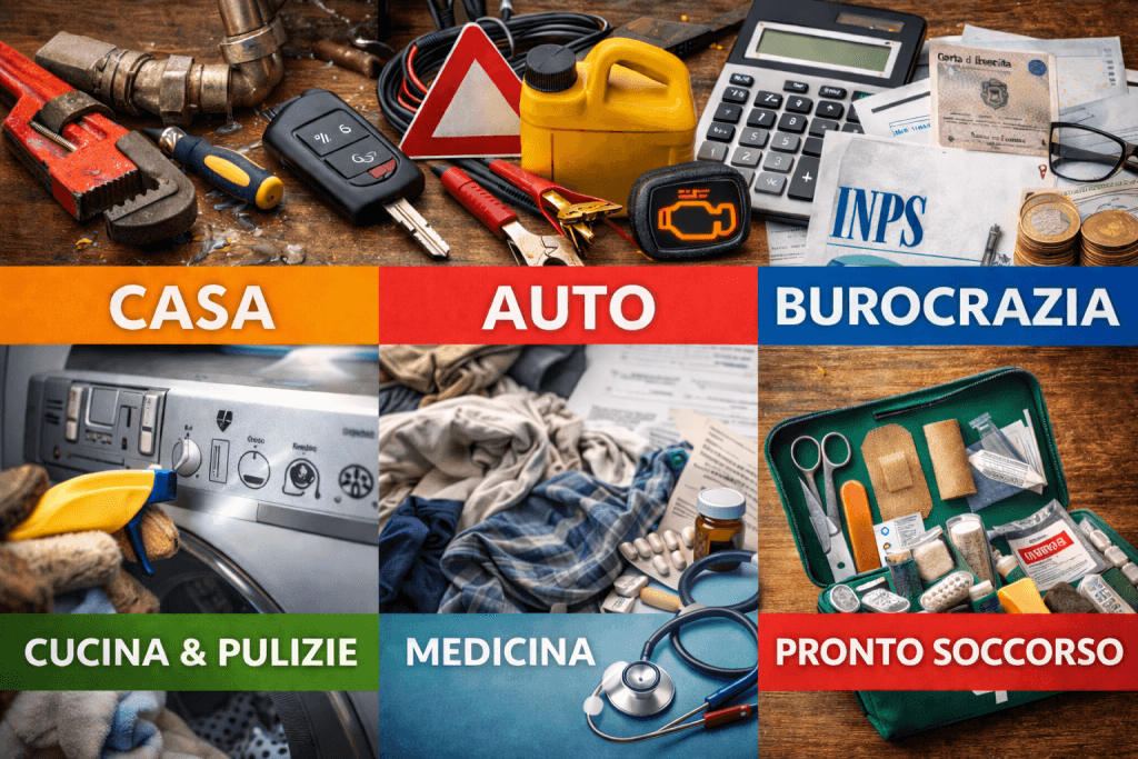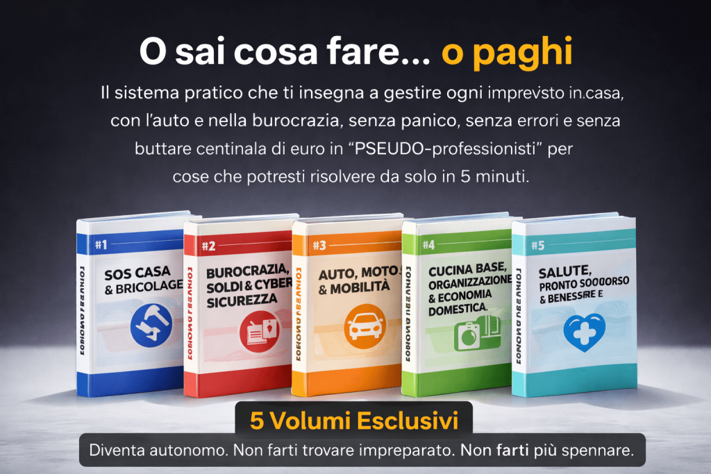 per gestire ogni imprevisto in casa, con l’ auto e nella burocrazia, senza panico, senza errori e senza buttare centinaia di euro in “PSEUDO-professionisti” per cose che potresti risolvere da solo in 5 minuti.
