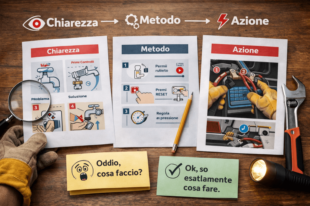 Ogni problema è scomposto in step logici: cosa controllare, cosa fare, cosa evitare.